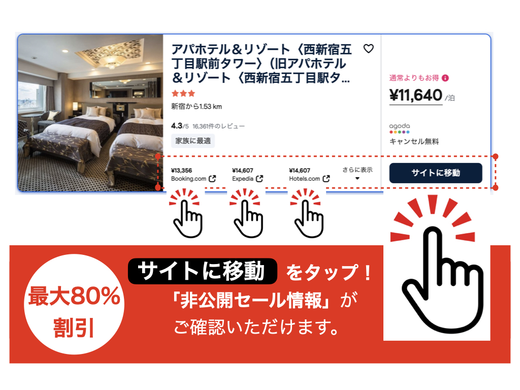 最大80%OFFの「非公開セール情報」(予約サイトでの割引)をご確認いただけます。
