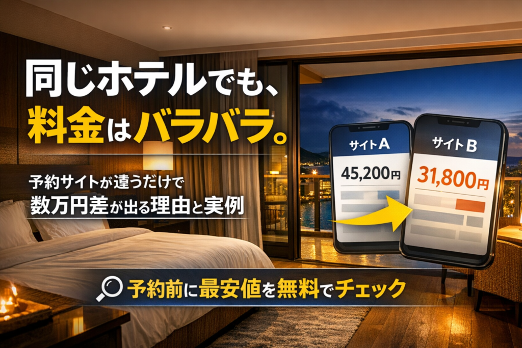 - 国内外のホテル予約サイトを一括比較できますので、時間とお手間をかけることなくホテル最安値がわかります。(agoda・楽天トラベル・じゃらん・Expedia・JTB・Booking. com・Trip. com・Hotels. comなど)